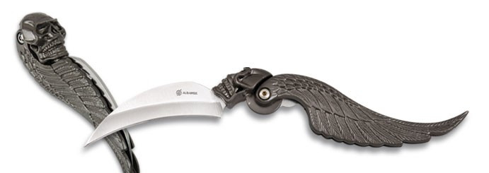 - Zamak Handle with Skull and Wing Design: The Zamak handle with the skull and wing design gives this knife a distinctive and eye-catching look. In addition to its visual appeal, it provides a comfortable and secure grip.