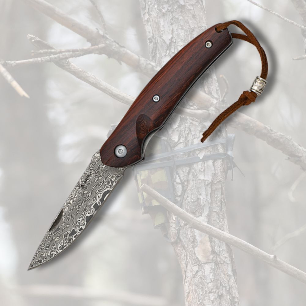 The blade, made of Damascus steel, features an impressive pattern of 70 layers that not only beautifies but also guarantees exceptional durability. Its sharp and curved shape is designed to offer precise cutting, making it the ideal companion for your outdoor adventures, whether camping, hiking, or simply in your home kitchen.