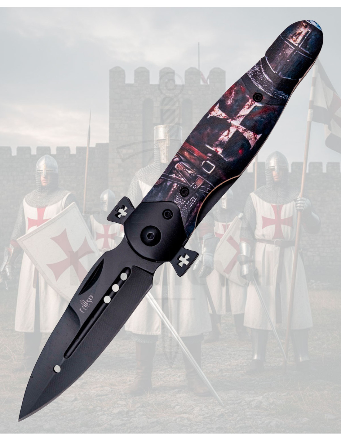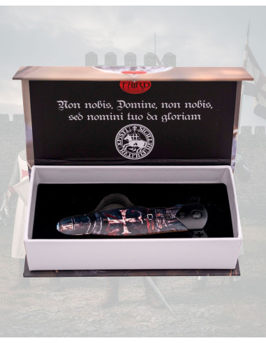 The beech wood handle with a 3D relief recreates the figure of a hospitaller warrior, offering a secure and ergonomic grip, made to make each maneuver feel natural and controlled. The darker tones and contrasts in red and gray add character, making it a piece that stands out.