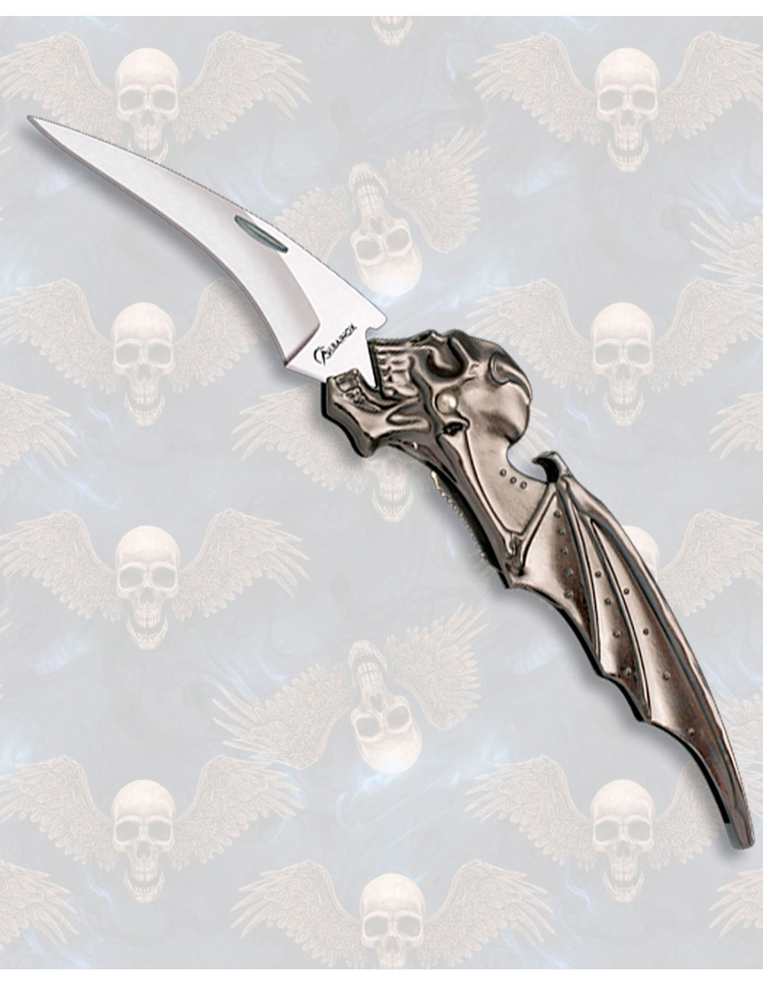 El mango es una pequeña escultura en la mano, con una calavera tridimensional que conserva mandíbula, dientes y huecos que parecen respirar historia. Las 'alas' que emergen del diseño, remachadas y articuladas en apariencia, suman textura y movimiento visual, mientras el acabado metálico envejecido del mango le da ese carácter rudo y trabajado que buscas para una vitrina o un regalo con personalidad.