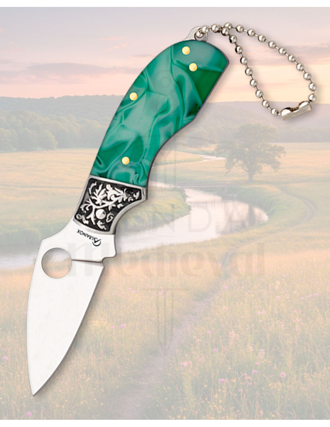 The handle in green acrylic features a marbled pattern that makes it a distinctive piece, as well as providing a pleasant and firm grip. The golden metal rivets and the decorative embossed central piece add character without sacrificing strength, while the steel liners reinforce its structure.