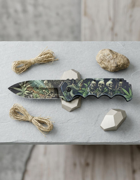 This knife is not just a tool; it is an extension of your character. The 9 cm stainless steel blade, with its decorated 3D finish, showcases an impactful art that reflects your bold spirit, while its ergonomic handle, decorated and with multiple notches, provides a firm and secure grip in every movement. The artistic design, featuring skeletons, plants, and crocodiles, covers every inch, projecting strength and mystery. Moreover, its liner lock mechanism and dual-use functions with clip and flipper turn every use into an experience of absolute control, making you feel ready for any situation, no matter what challenges you face along the way.