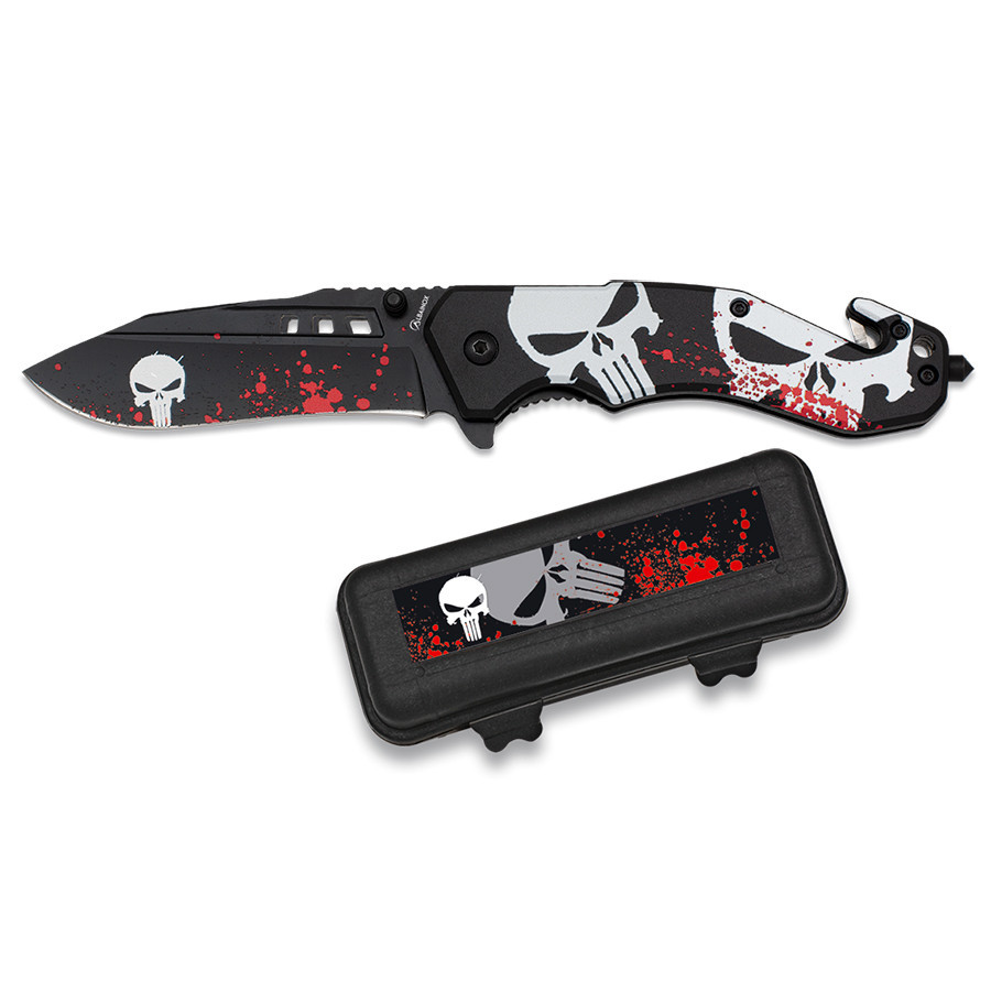 Tactical rescue knife 3D black Skull design. This knife not only offers an eye-catching design with its skull embossed design, but also has rescue features that will give you a sense of security in any situation.