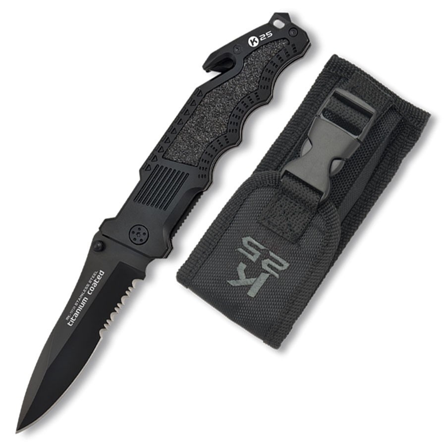 The black K25 Rescue Knife is the perfect tool for rescue and emergency situations. With its 10.7 cm titanium-coated stainless steel blade, this knife guarantees exceptional durability and corrosion resistance, ensuring reliable performance every time.