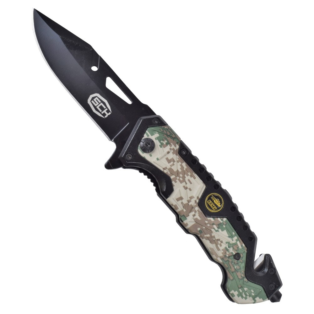 Be prepared for any emergency situation with the SCK Urban Camo Army Rescue Knife! This essential instrument is designed to offer you maximum functionality and confidence in critical situations. Featuring a high-quality stainless steel black blade, this knife offers exceptional durability and consistent sharpness, even in the most challenging conditions. Its ergonomic aluminum and plastic handle design gives you a safe and comfortable grip, allowing you to handle it with precision and ease. The spring assisted open feature gives you a quick response, ensuring you're ready to go in seconds. In addition, its Liner Lock locking system keeps the blade firmly in place, providing you with security and stability during use.