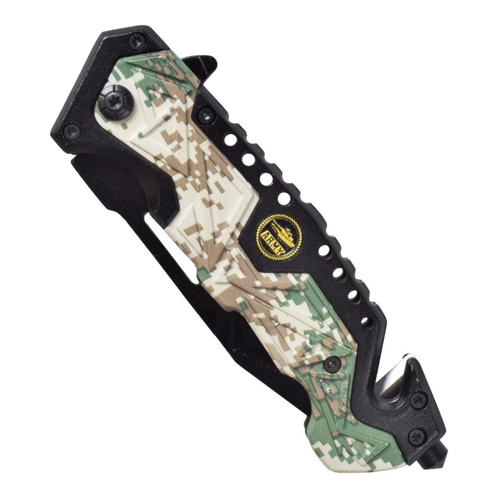 With a built-in belt clip, you'll be able to take this knife with you everywhere, keeping it always accessible when you need it most. With a compact closed size of 122mm and an overall length of 203mm, it's perfect to accompany you on your outdoor adventures or rescue situations. Don't compromise your safety and preparation. With the SCK Urban Camo Army Rescue Knife, you get a superior quality product that combines functionality and reliability in one package. Don't wait any longer and buy this essential knife to always be prepared for any eventuality!