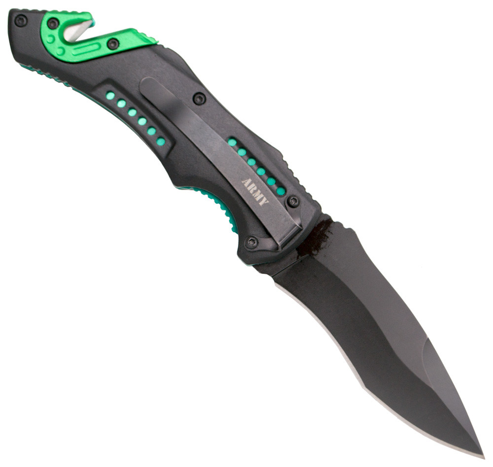 The knife's handle, made of black aluminum, provides a perfect balance between lightness and strength. This ergonomic design ensures a firm and comfortable grip, even in adverse situations. The green linings not only provide a distinctive touch that reflects the military spirit, but also facilitate quick identification of the tool in complex environments.