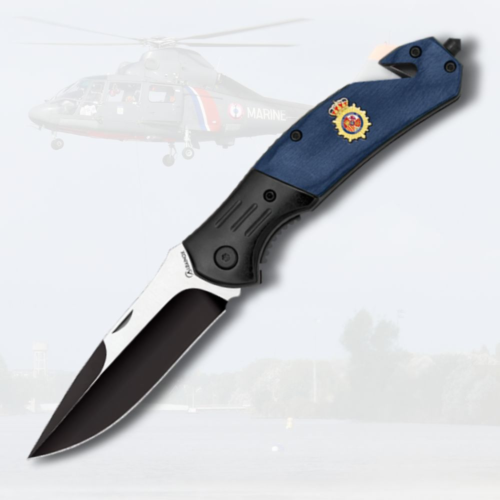With a high-performance steel blade and a brushed black finish, it offers precise cuts and durability over time. Its ergonomic design and blue-toned handle ensure a comfortable and secure grip, even in demanding circumstances. It includes an effective seatbelt cutter and a steel glass breaker, making it a perfect tool for rescues or other eventualities.