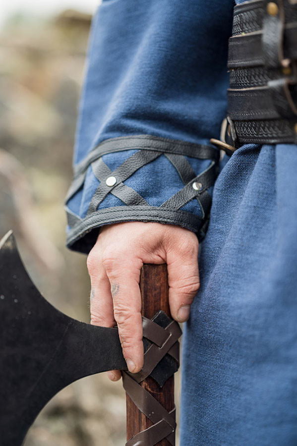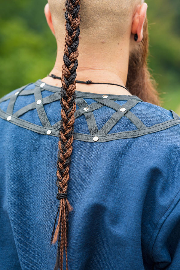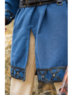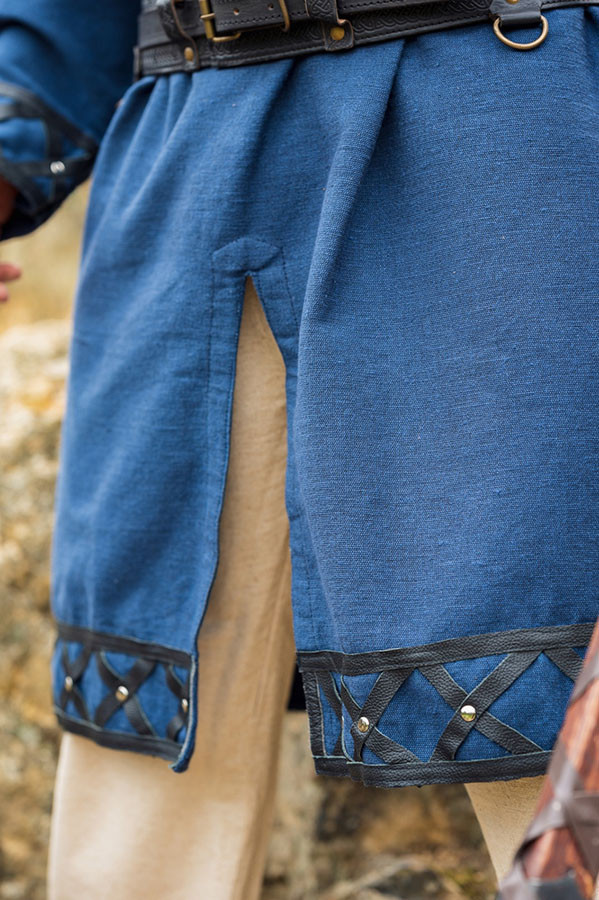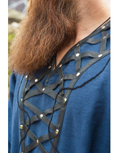 Discover the authentic Viking essence with our Erik tunic, available in an elegant dark blue color. This tunic is made of 100% cotton, which makes it soft and comfortable to wear. In addition, it has riveted leather decorations that give it a unique and distinctive touch.