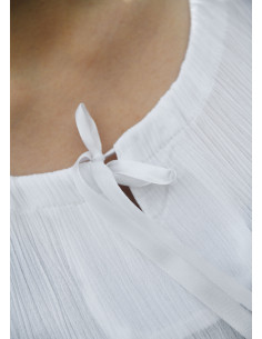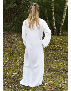 Immerse yourself in the medieval essence with the lightweight medieval inner tunic with wrinkled effect, in white. This tunic features a loose cut and floor-length design, crafted from a lightweight viscose fabric with a wrinkled effect. The fabric is slightly transparent, adding a touch of mystery and elegance. The sleeve cuffs are gathered with an elastic band, while the neckline can be individually adjusted with a satin ribbon.