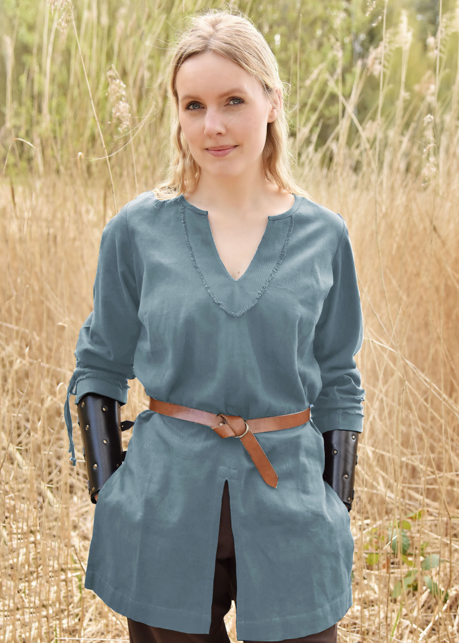 Although it is not historically known that Viking women wore tunics, the Ylva is perfect for the representation of many Nordic and Central European peoples from the time of people migration and the Middle Ages. Pair this tunic with simple pants and leather details for a rugged and authentic look. Don't miss out on the opportunity to look like an authentic Viking warrior with the Ylva Viking women's tunic in blue.