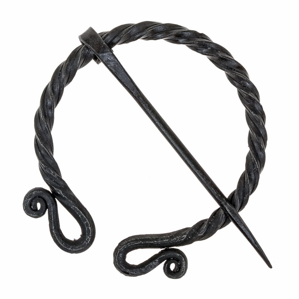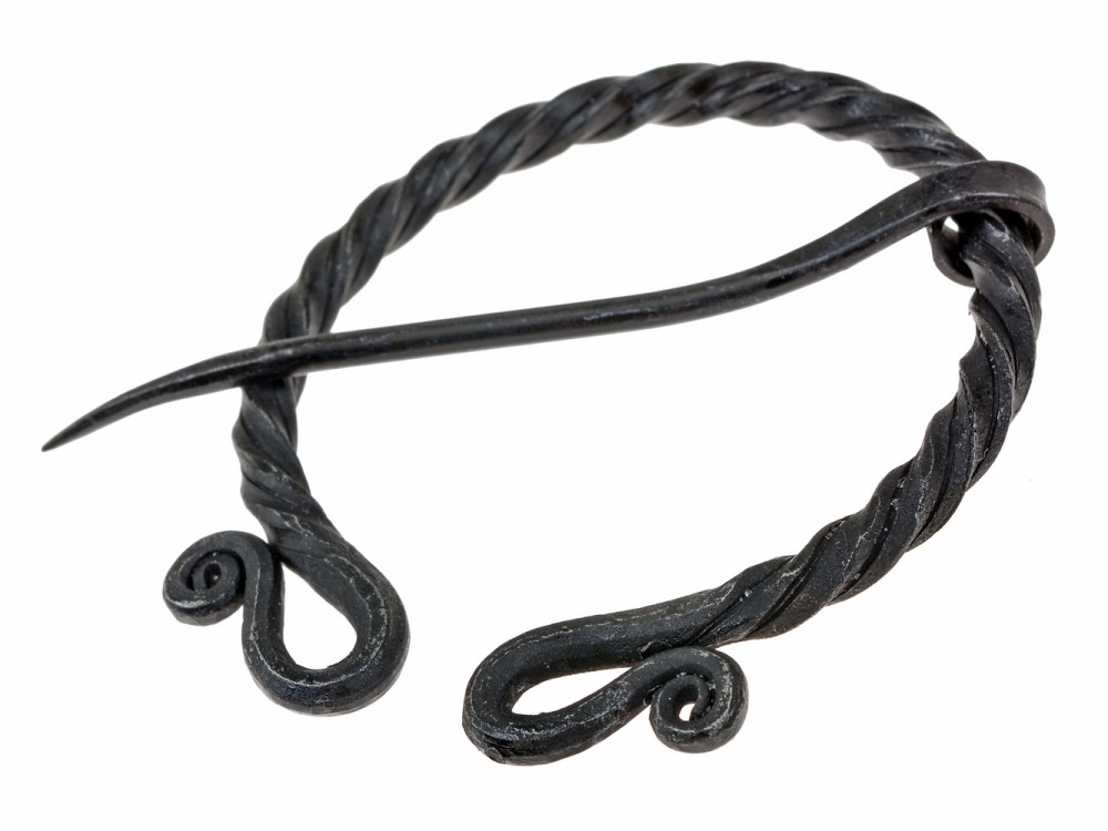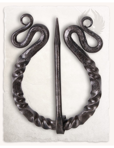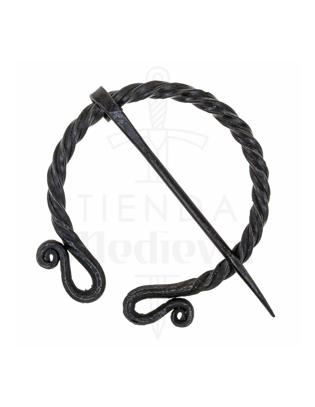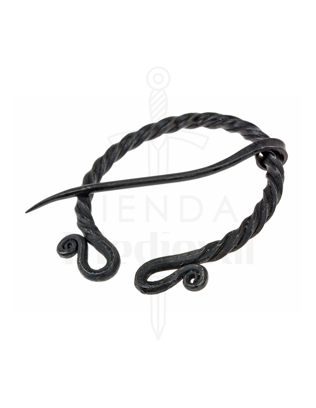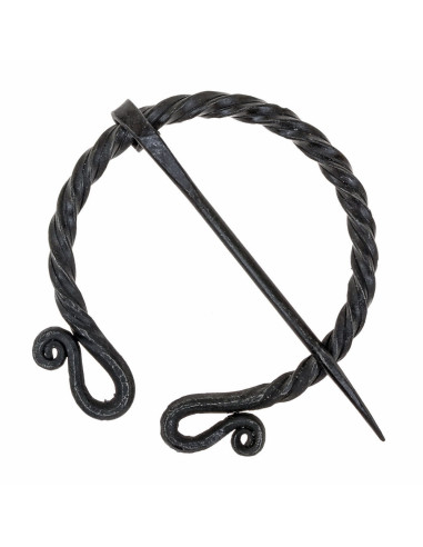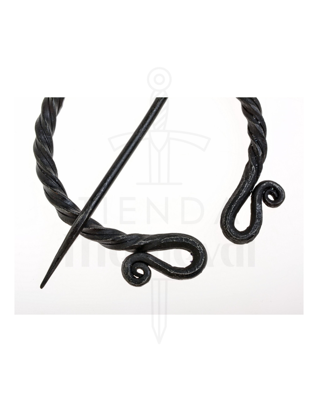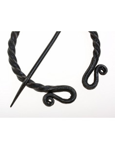 This hand-forged piece features a ring made of two twisted rods that create a perfect omega, finished with decorative spirals, and a long pin that slides through the interior of the ring for a clean and secure closure. The matte black surface and slightly rough texture enhance its rustic presence, ideal for those seeking an accessory with character that doesn't attract attention ostentatiously.