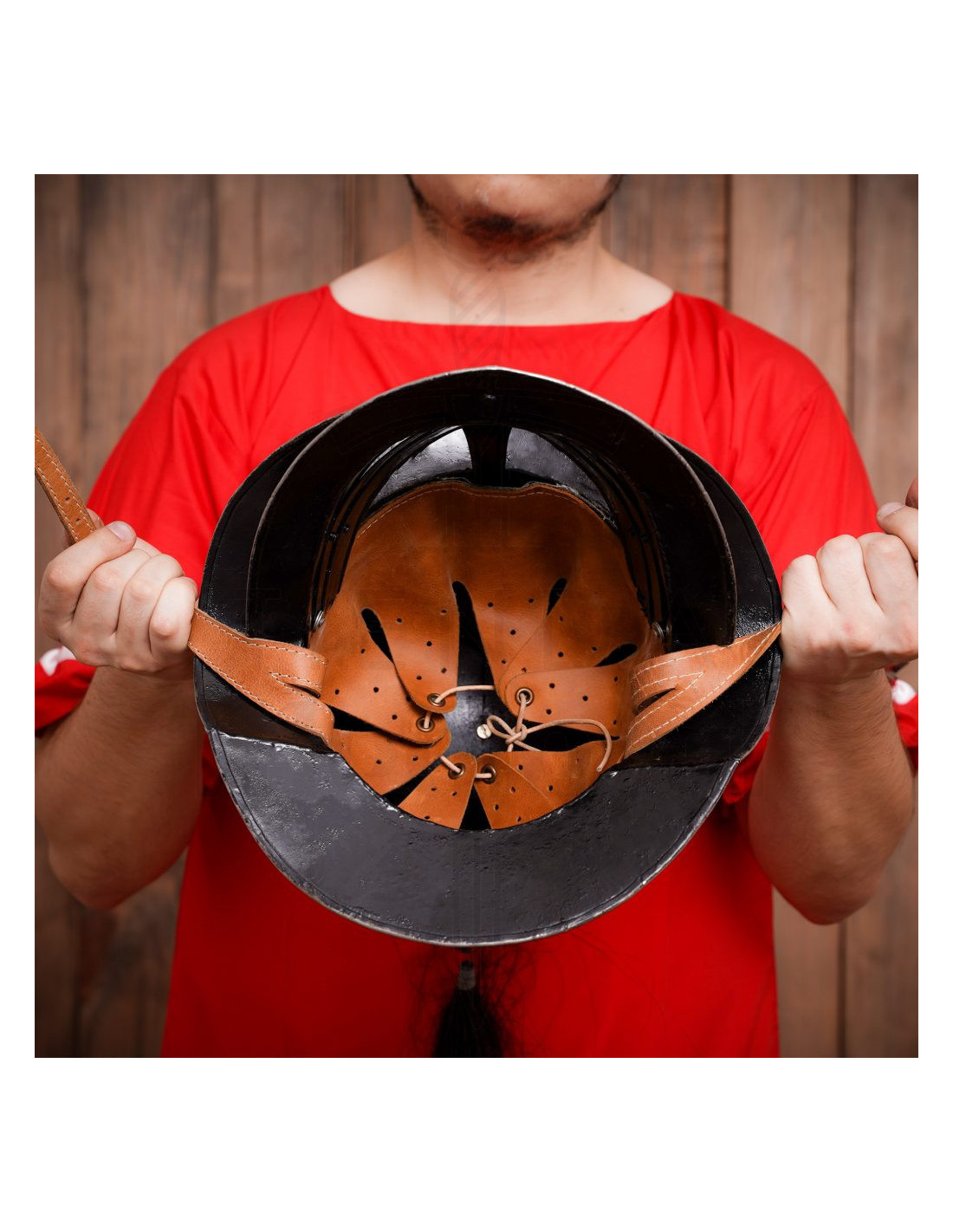 The movable visor and the wide front brim not only reinforce its faithful appearance to ancient armors but also add functionality by allowing the modulation of face protection and silhouette according to the occasion, from displays to reenactment events. The structure offers realistic coverage for the head and cheeks, with riveted details that enhance its visual authenticity.