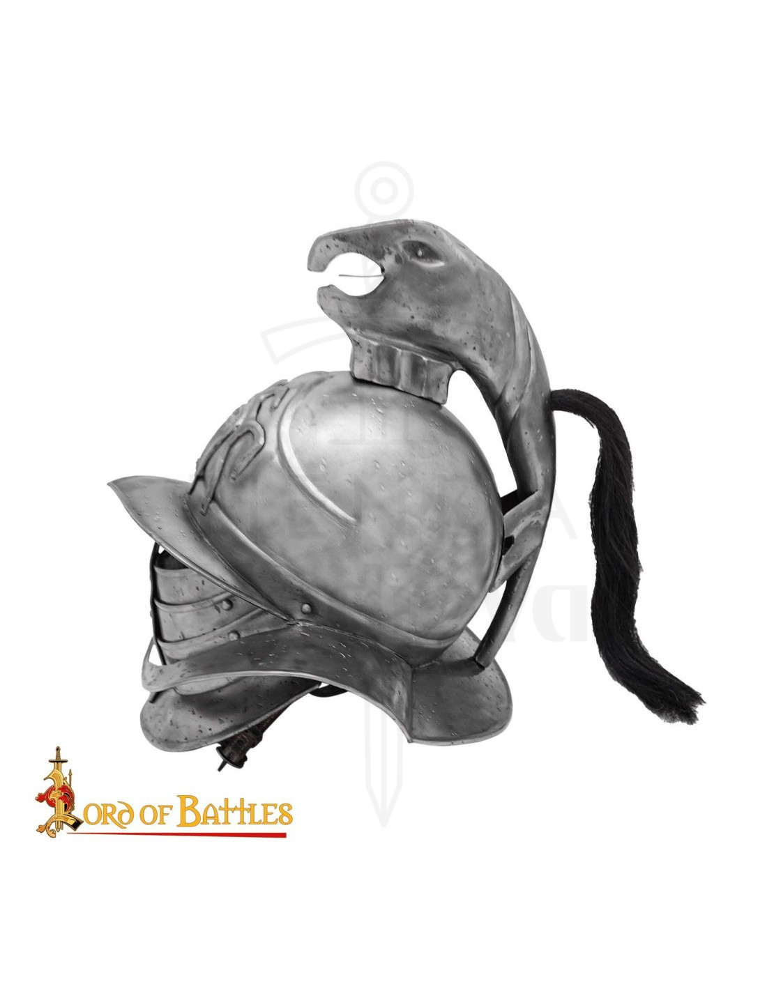This steel-carved design offers an imposing presence that speaks of resilience and character, thanks to its aged finish that mimics battle scars and gives it an authentic and dramatic appearance. The eagle-shaped crest and the frontal relief provide the symbolic seal of power and challenge, transforming the helmet into a piece that draws gazes and awakens stories.