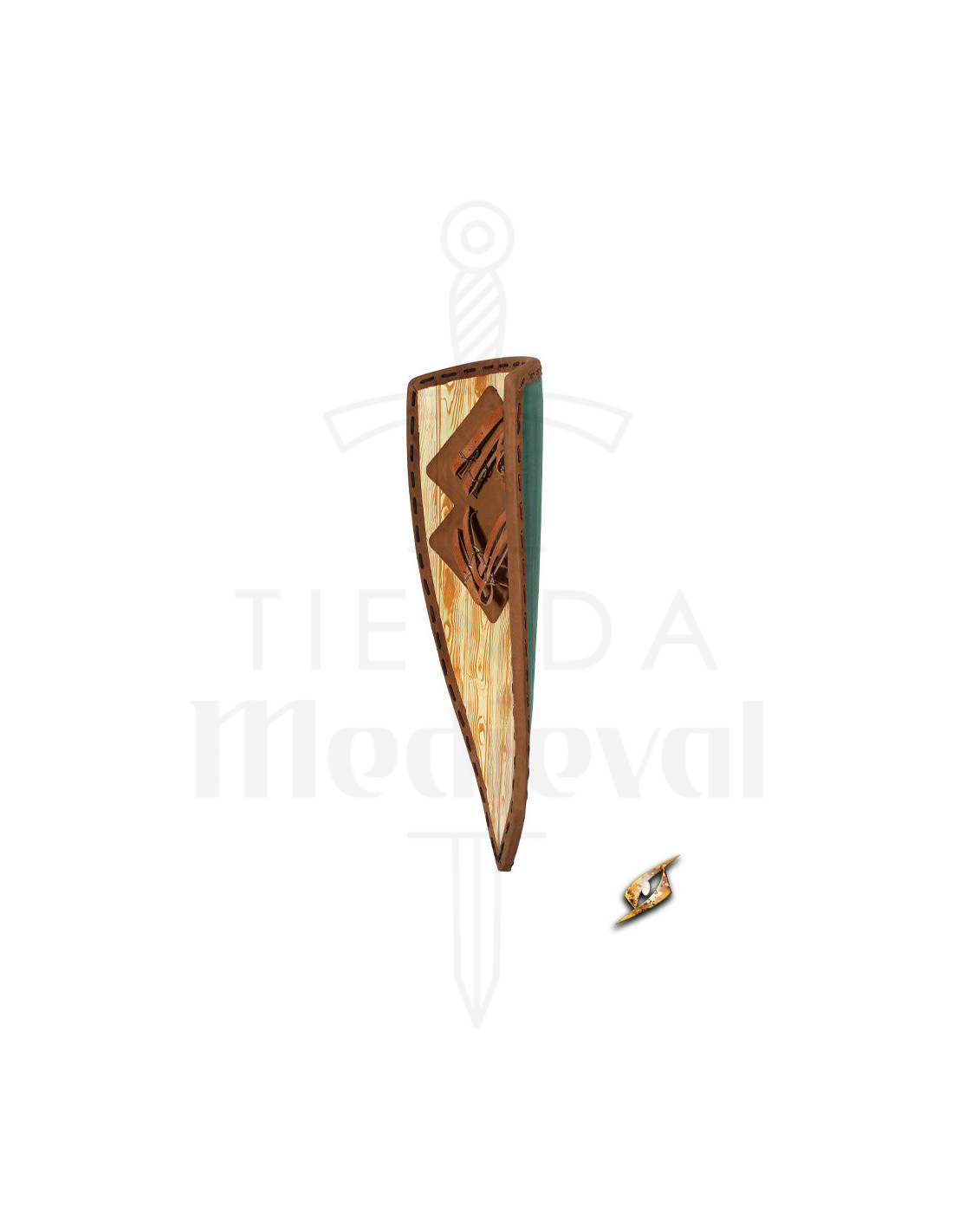 With a design inspired by war shields from the Early Middle Ages, its structure made of molded EVA foam and hand-painted simulates the appearance of aged wood, providing an authentic and durable look. The textured surface, with a matte finish, gives a worn and realistic appearance, perfect for adding character to your outfit.