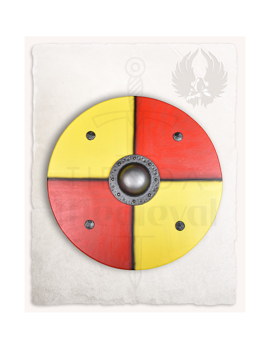 Do you want to look authentic in your Larp games or medieval events? This large and eye-catching shield, inspired by Viking aesthetics, will allow you to stand out in every combat. Its circular design and colorful tones in yellow and red divided into four sections, with a raised metallic center, add a touch of realism and battle spirit.