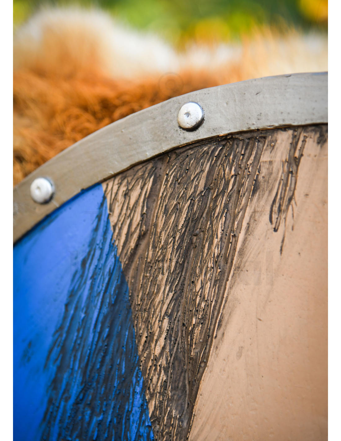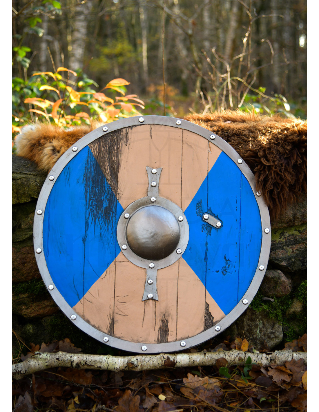 Its rustic aesthetic and visible grain give it the appearance of aged wood, while the finish in shades of blue and beige, divided into four sections, adds character and presence to any scene. The metal ring with rivets and the domed central protector reinforce the impression of equipment forged for combat, without sacrificing the safety and lightness you need in action.