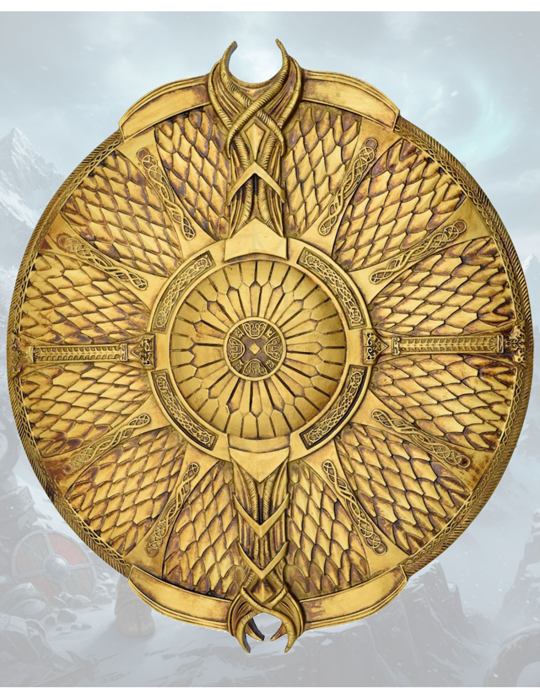 This officially unofficial decorative shield of Kratos, God of War offers that epic presence effortlessly, thanks to its circular design with detailed relief that combines scale or feather motifs and braiding that evoke ancient craftsmanship. The aged gold finish enhances every contour, creating shadows and highlights that make the relief stand out from any angle, while the crosses and structures that traverse it add a dynamic and symbolic character.
