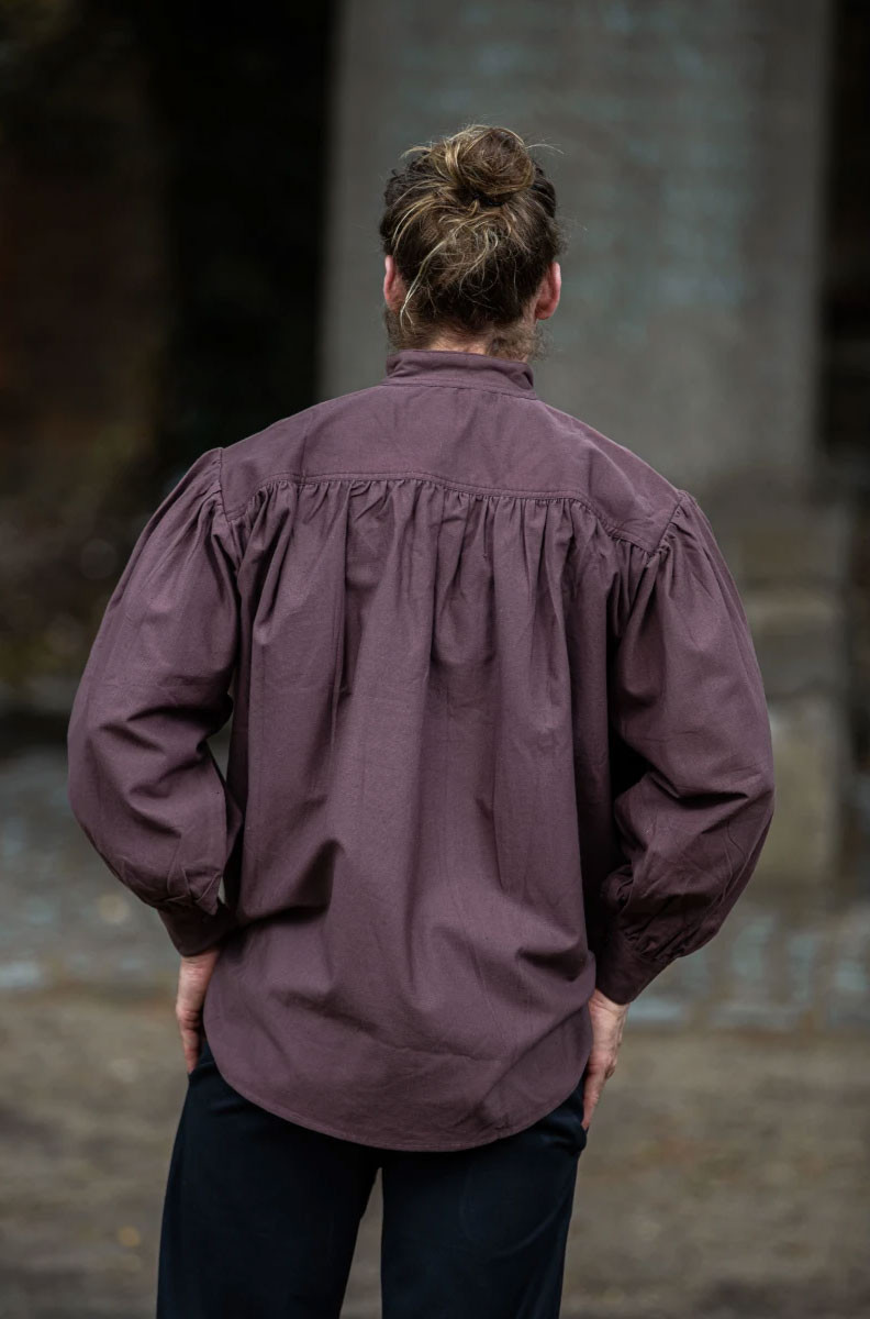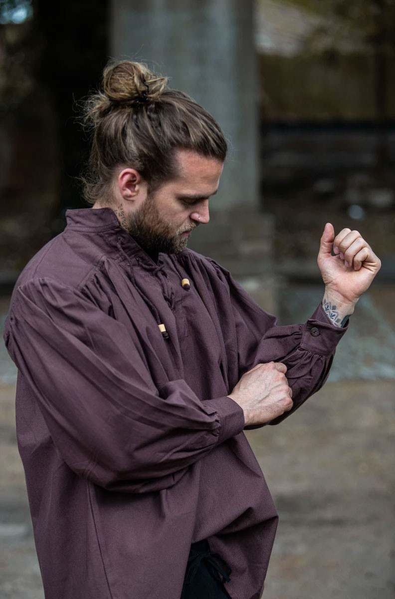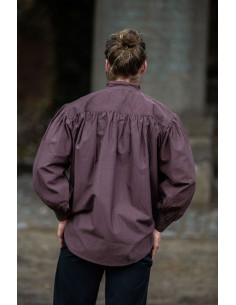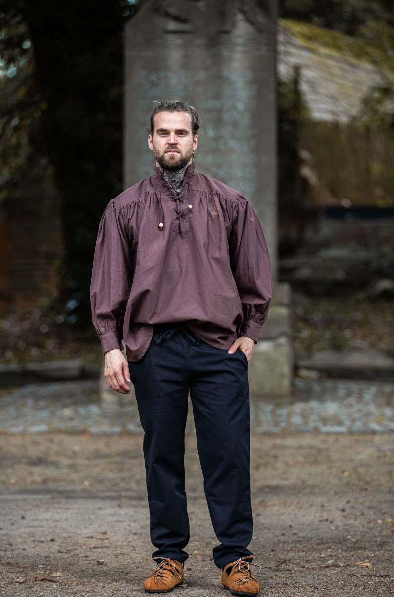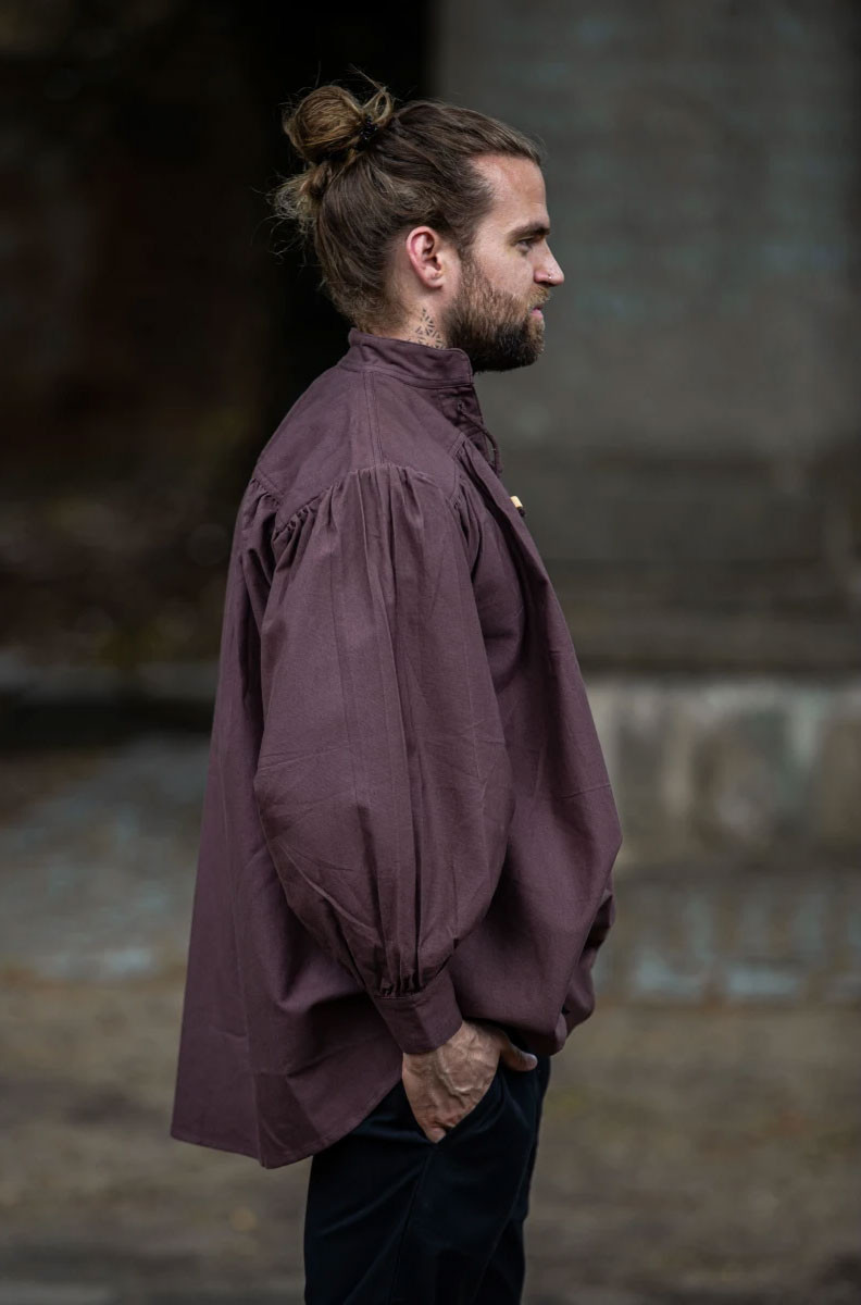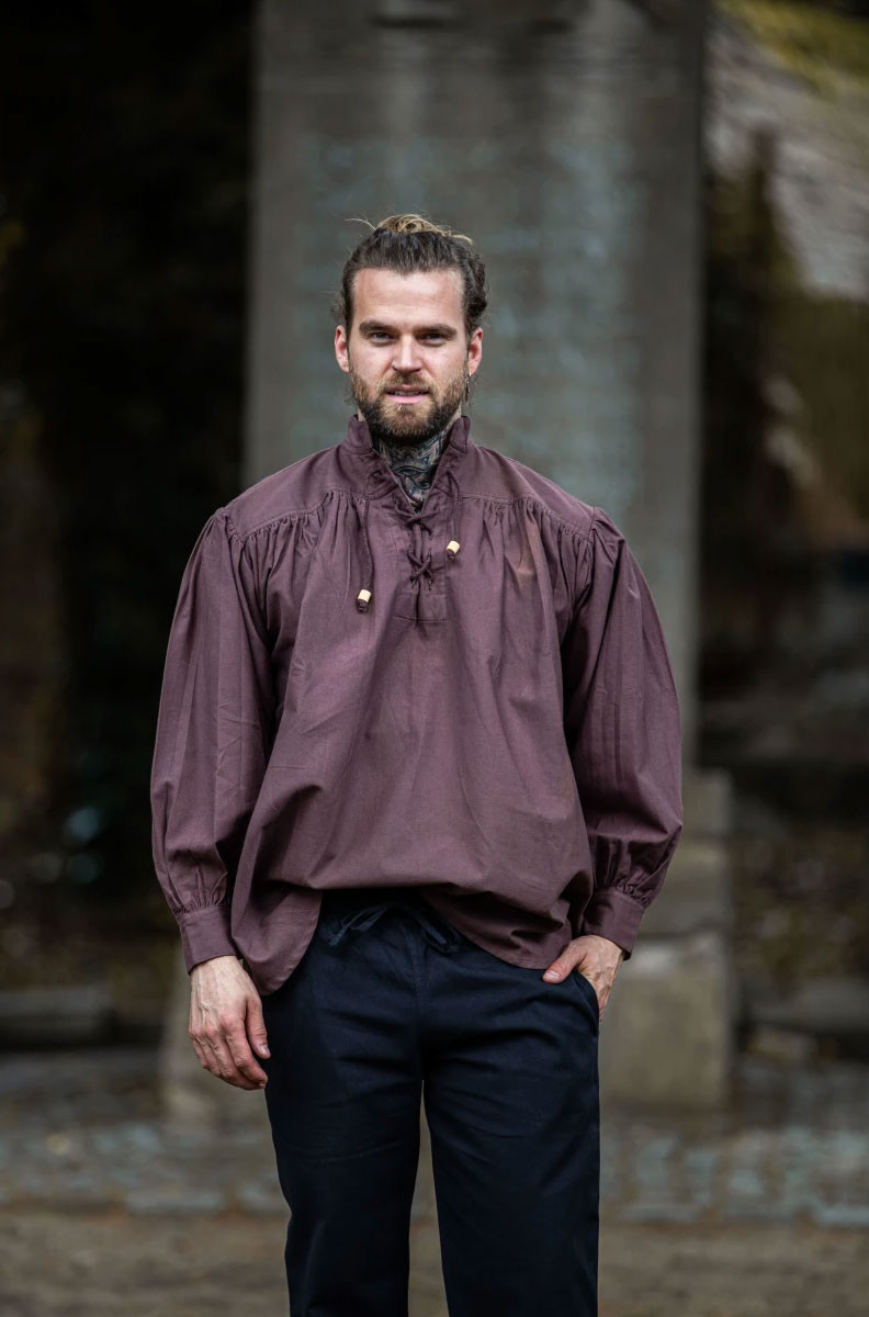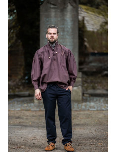 Do you want to look like a real medieval knight? Then this shirt is perfect for you. It is a wide-cut medieval shirt with ties in the neck area, available in an elegant brown color.