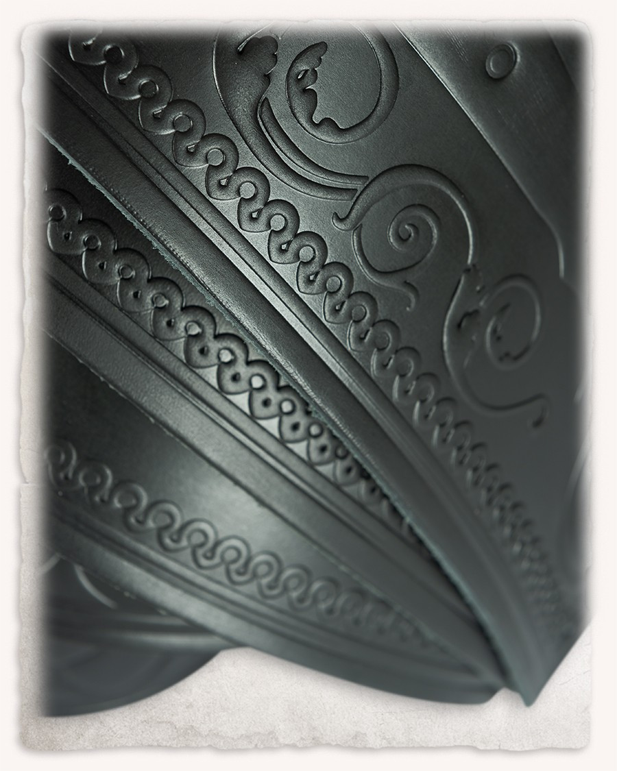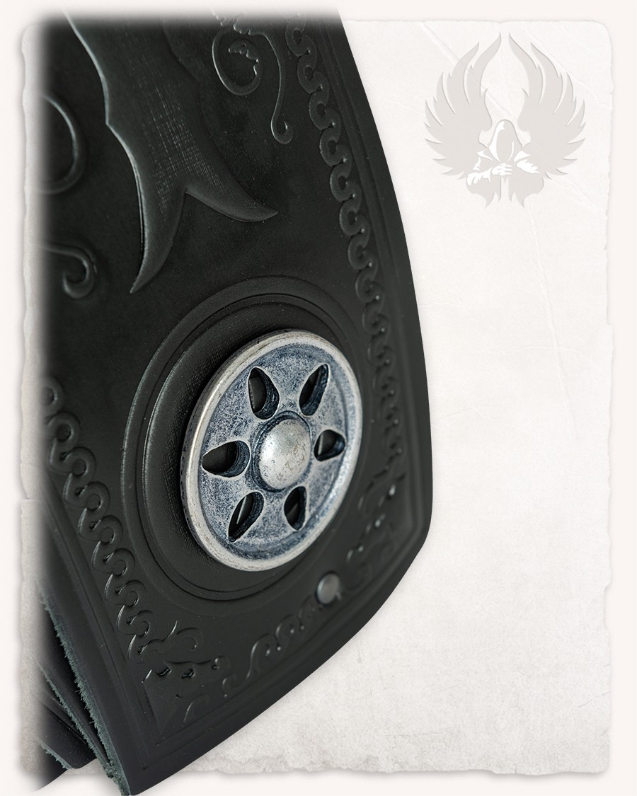 The 'Gawain' embossed leather shoulder pads feature an attractive pattern of scales and perforated flowers that complement the torso armor. Here are some key features of these shoulder pads:
