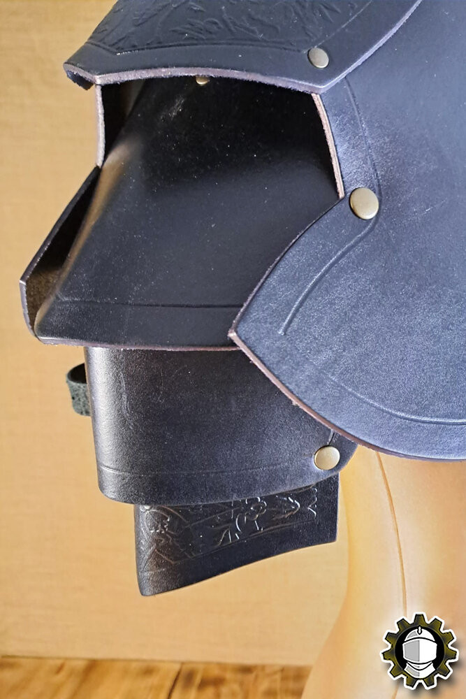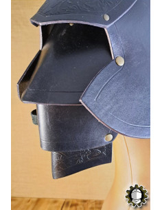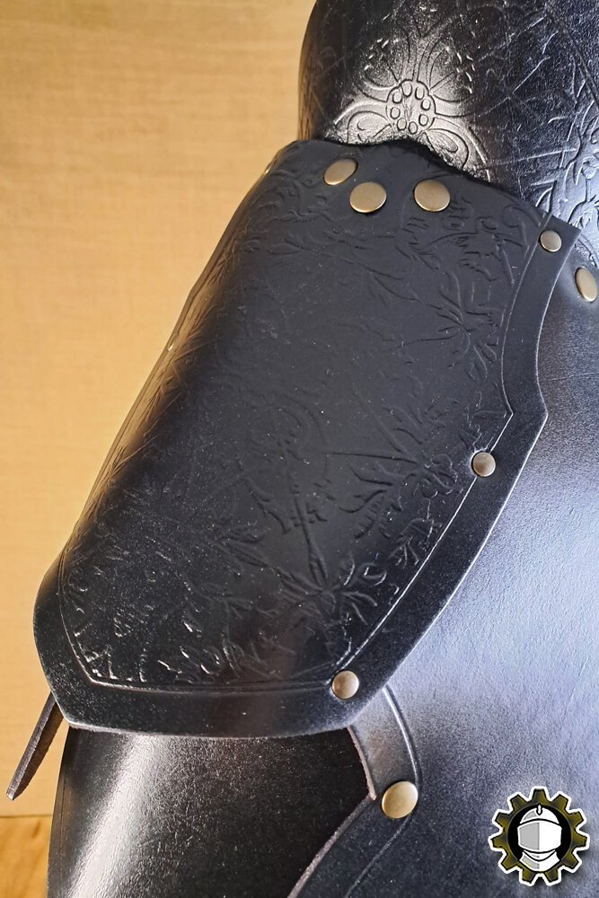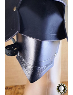Every detail matters: made from high-quality black leather, the 'Brian' shoulder pads not only command the environment with their intimidating presence but also provide effective protection. Their robust and ornate design is not merely decorative, as they feature an ingenious system that includes a swordbreaker, a functional touch that protects your skin from unexpected blows.