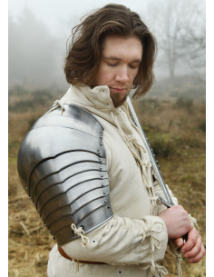 Made from 1.2 mm steel—a durable yet lightweight material that combines durability with comfort—these pauldrons feature a black finish that not only adds a touch of authenticity but also protects against corrosion, ensuring they maintain their impeccable appearance over time. Their design is inspired by 15th and 16th-century Gothic armor, with multiple segments and precise details, reflecting the craftsmanship of the era and allowing you to proudly display a realistic and detailed medieval style.