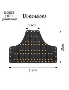 The multiple overlapping rectangular plates, fastened with brass rivets, distribute impacts and reinforce the surface, while the black finish enhances any dark outfit and adds an air of historical gravitas. The golden rivets not only secure its durability but also create a visual contrast that elevates the ensemble without overwhelming it.