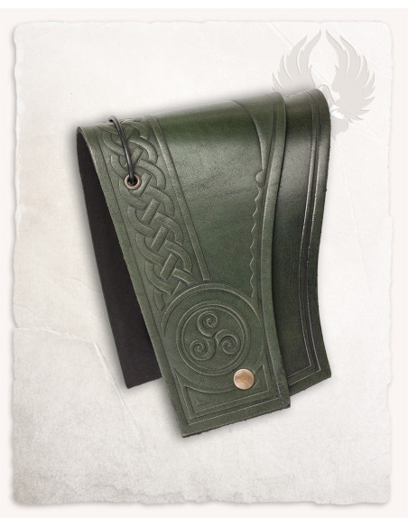 The dark green leather finish, with a worked patina, adds depth and character to each piece, while the natural-tone interior provides a softer contact with the skin for prolonged use. The relief with Celtic knots and the central triskelion enhance the personality of the set, adding a focal point that can be appreciated both up close and from a distance. A defined trim and a small metallic rivet reinforce the outline, adding visual detail and a sense of authenticity.