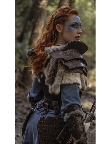 Produced by Fucina del Drago, known for its high-quality leather and elaborate finishes, these shoulder guards blend artisanal aesthetics with durability. Their profile and decoration make them especially suitable for representations of Nordic inspiration, as the Celtic motifs and the symbol of three spirals connect with the traditional iconography shared by many medieval and mythological universes.