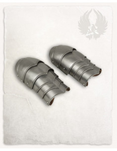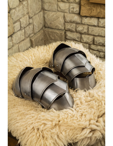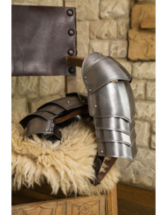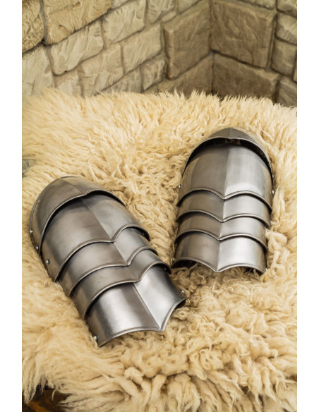 The curved design and polished surface create a shiny finish, enhancing any armor set and providing a sophisticated aesthetic in historical combat or display. The anatomy of the pieces adapts to the natural curvature of the arm, resulting in a comfortable fit and a more secure stance, without uncomfortable chafing or hindrances to arm movement.