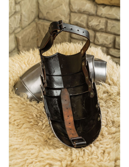 Internally, the straps allow for the integration of additional protection according to your needs, offering versatility for different usage levels. The visible rivets secure the plates together, conveying robustness and a sense of assembly designed to last, with symmetrical lines clearly differentiating the right piece from the left.