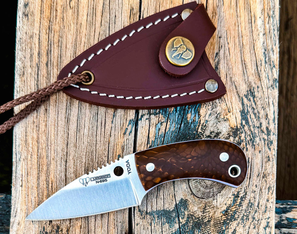 Yoda Juma knives brown handle by Cudeman, leather sheath