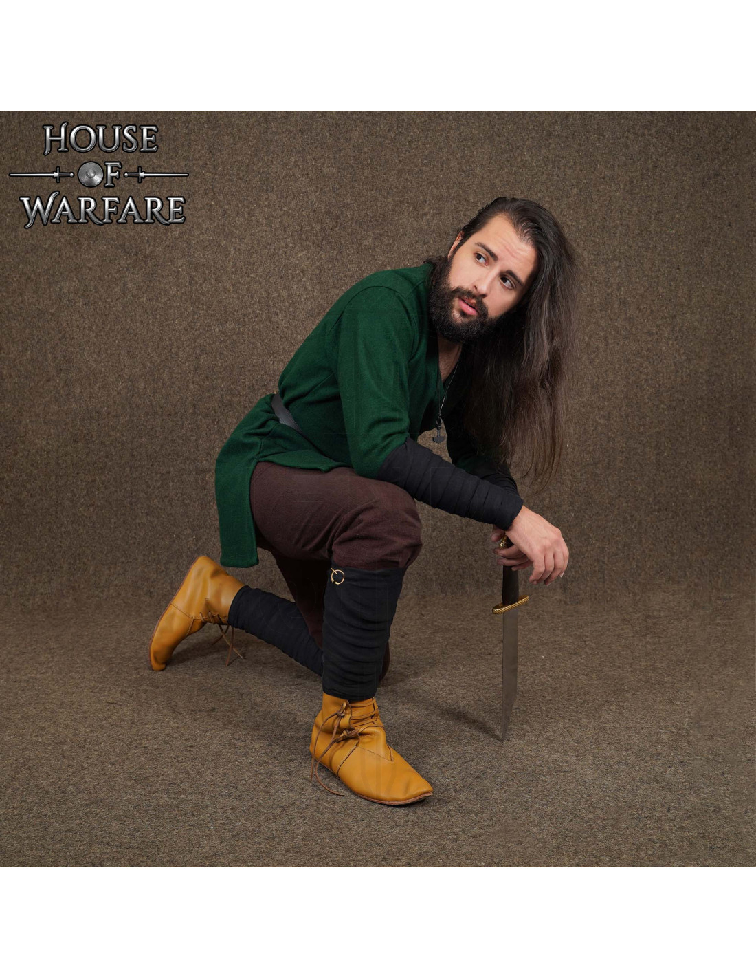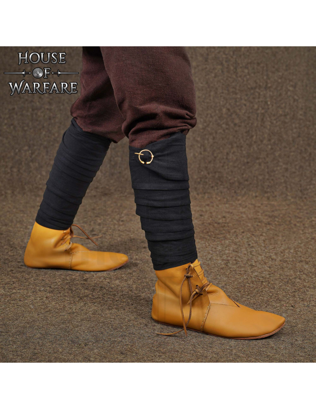 Made from breathable cotton and featuring a durable finish, they adjust easily to keep your pants in place and prevent chafing from boots or armor pieces, enhancing mobility and comfort during long days of reenactment or festivals. The closure with brass fibulas provides a secure fastening and a metallic visual point that stands out against the deep black of the fabric.