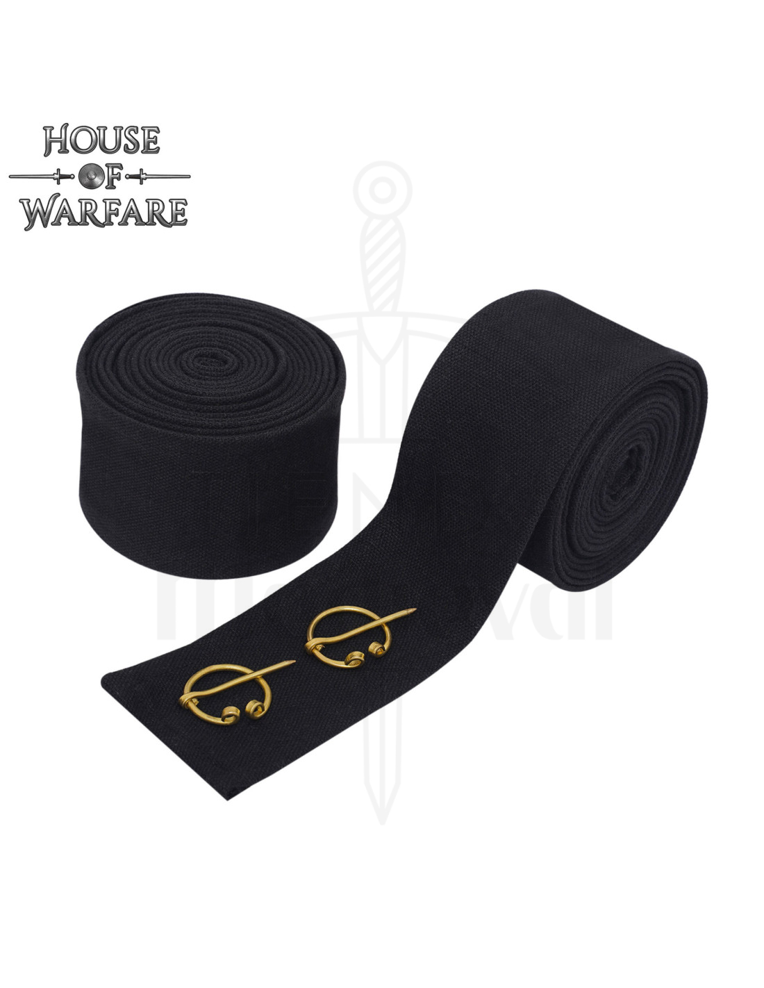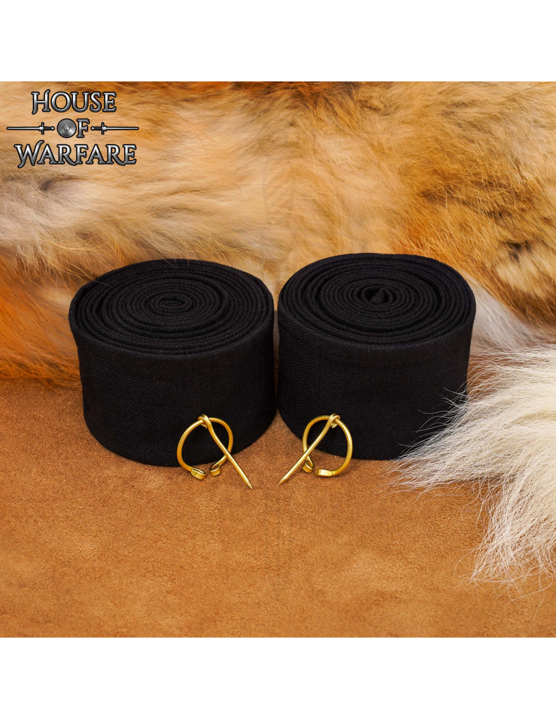 The image shows two black rolls, one compact and another partially unrolled displaying the texture of the fabric, as well as two golden metal clasps with bars and decorative spirals, which add a touch of historical detail and serve as an elegant and functional closure system.