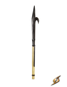 This foam spear, designed with ease of transport and storage in mind, consists of two parts that securely connect, making it easy to handle in any LARP scenario. Its head, featuring a sharp blade-like end and a hook on one side, offers multiple tactical options to cut, hook, or block your rivals.