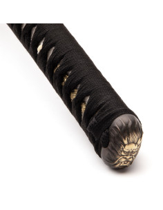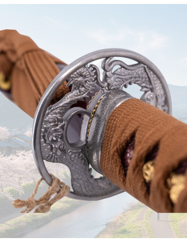 The tsuba, or guard, is decorated with a dragon, a key figure in Japanese mythology that symbolizes power, protection, and control over the elements, such as rain and rivers. The detailing on the tsuba not only evokes these powerful images, but also contributes to the katana's balance and functionality. Metal components, such as the pommel, are made from brass with an antiqued finish that enhances its classic, robust appearance.