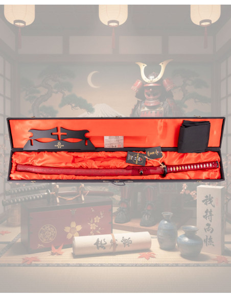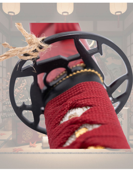 The scabbard dressed in red artificial leather, featuring a lotus-type floral relief and a decorative cord, protects the piece and turns it into an object ready for display, integrating tradition and decoration into a single set. Additionally, it comes with a stand, so you can proudly showcase it in any space.
