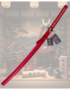 The handle wrapped in red and detailed with ray skin offers a secure and comfortable grip, designed to maintain control in every movement, while the sober circular black tsuba adds visual balance and classic functionality.