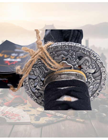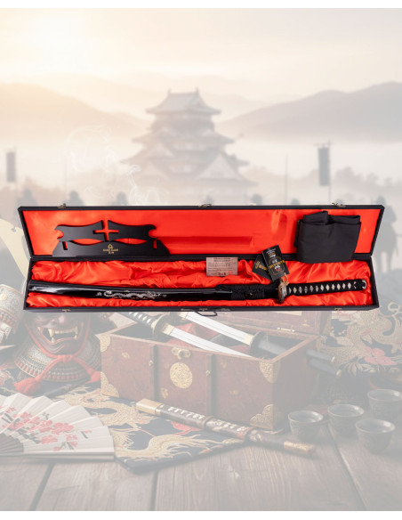 This katana embodies the calm of the night and the contained strength of shadows, designed for those seeking a piece with exceptional character and feel. The blade, forged from multiple certified layers of Damascus steel, displays a unique pattern that not only captivates the eye but also guarantees a sense of solidity and coherence with every movement. The black lacquered scabbard, adorned with a silver dragon inlay, adds a solemn finish that turns the set into a display-ready work, needing no ostentation.
