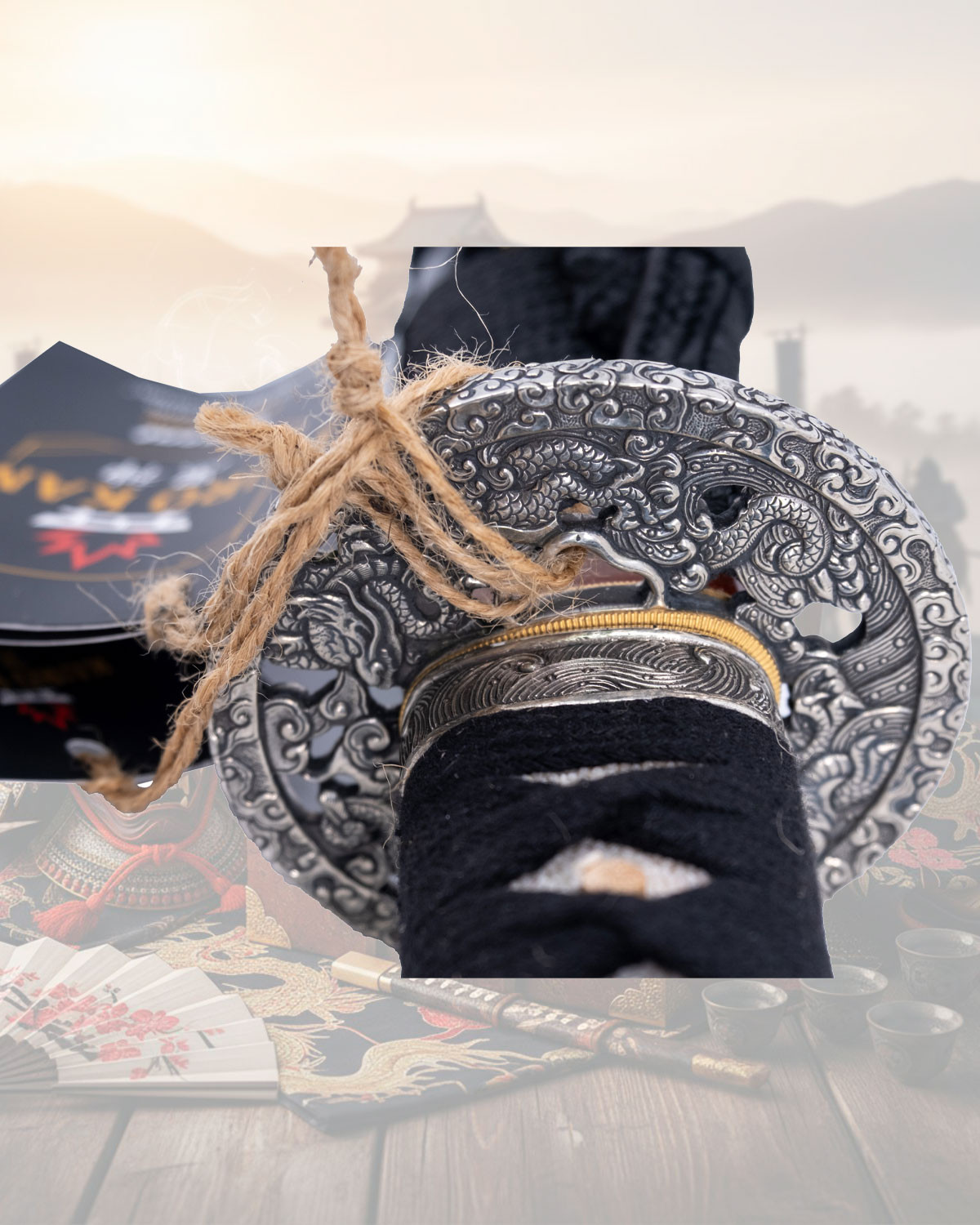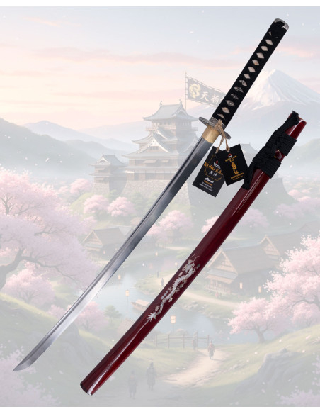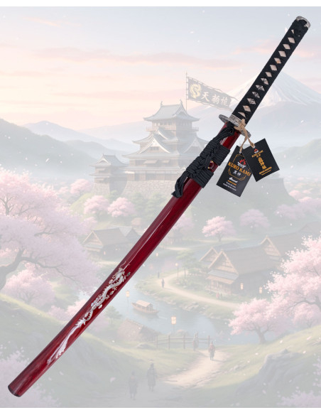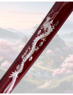 The design pays homage to the flame dragon, with details that elevate its presence: a lacquered wooden scabbard with inlays that evoke scales, and the images highlight silver reliefs against a dark background that accentuate the figure of the dragon. The metal guard features a textured relief that adds visual grip, while the cord wrappings on the handle and authentic ray skin combine touch and hold for safe and comfortable handling even during prolonged use.