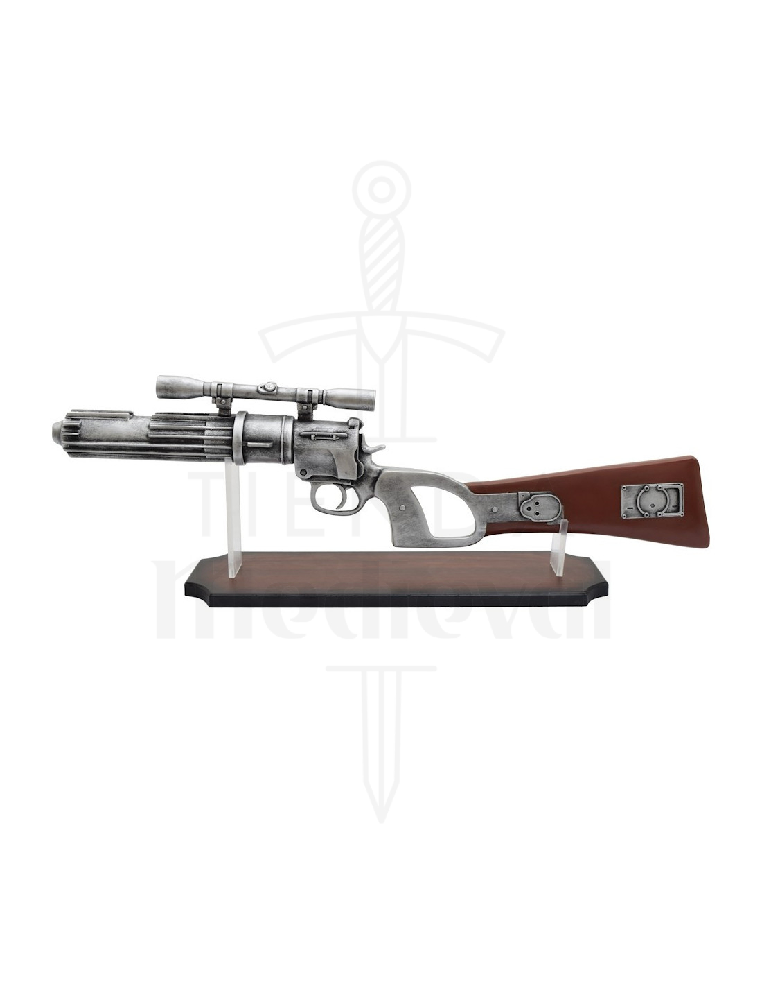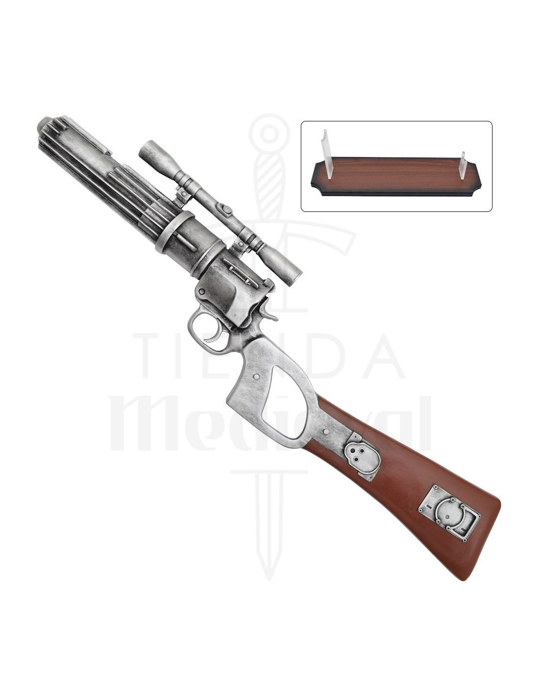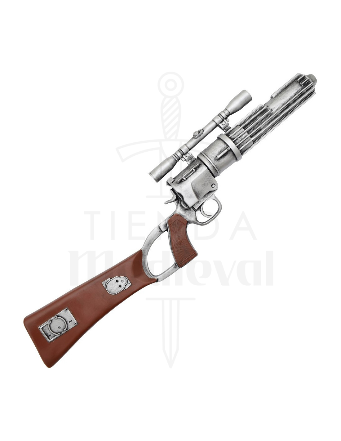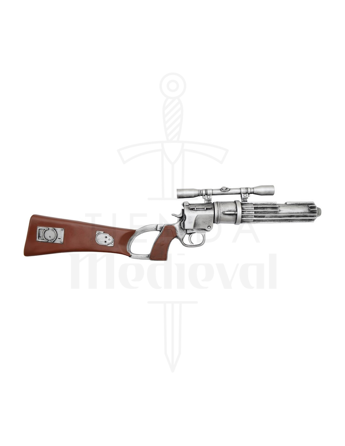 This rifle combines the classic aesthetic of a revolver with futuristic touches, offering a unique presence: the silver body with a cylinder and the long, grooved barrel provide a technical and detailed air, while the telescopic sight and the streamlined silhouette create a sense of cinematic authenticity. The high-quality resin finish allows for sharp details, ensuring that every texture and metal plate stands out at first glance.