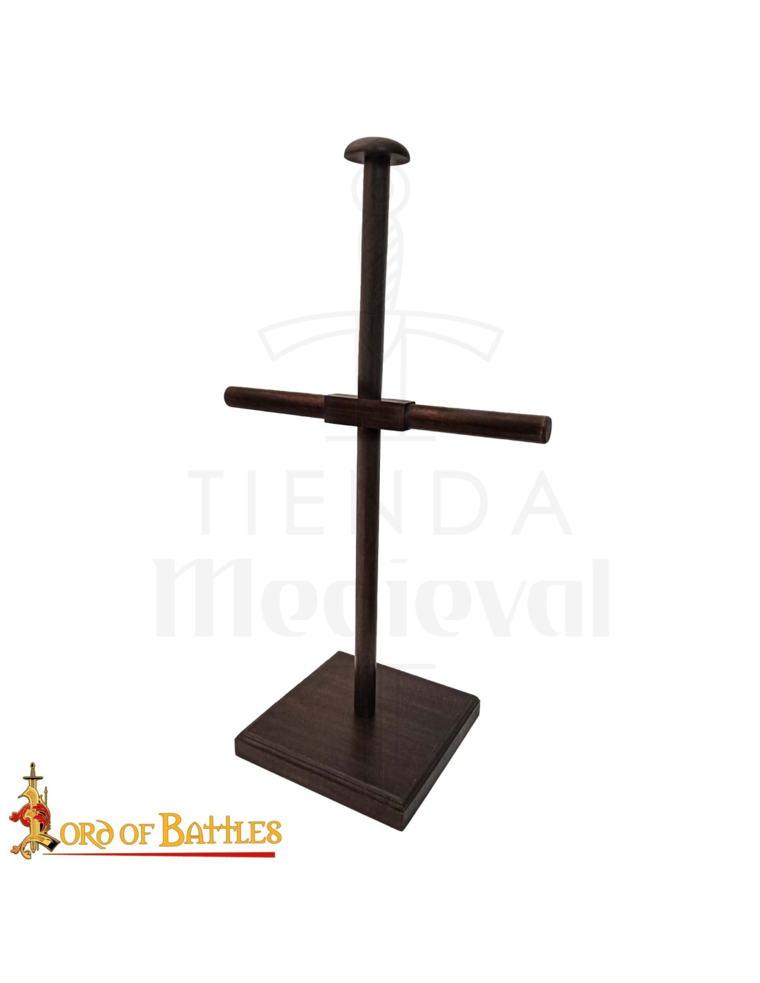 Built from polished solid wood, this stand provides a solid and stable base that protects your collection, preventing tipping and damage during exhibitions or transport. The shiny finish enhances the natural grain, adding a refined vintage look that complements both medieval spaces and modern environments without losing prominence.