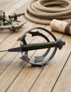 The authentic grip, crafted using the historical 'wet wrap' technique, provides a reliable hold, fitting comfortably in the hand and maintaining control even during quick maneuvers, instilling confidence in every move. The steel guard surrounding the hand protects and allows for safe use in tight spaces, such as the boardings described in sailors' tales.