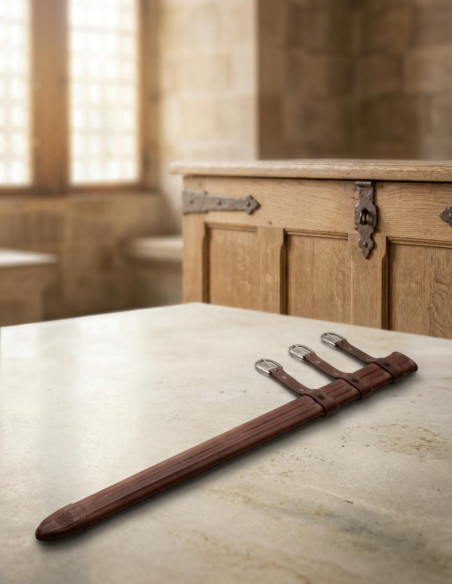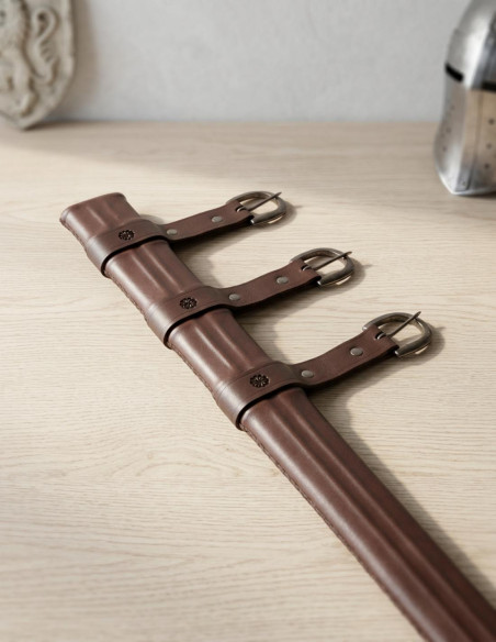 The scabbard, covered in leather over a wooden core, protects the blade and allows for silent and controlled drawing. The three adjustable straps and the matching belt make it easy to carry comfortably or display in a collection, keeping the sheath secure and aligned.