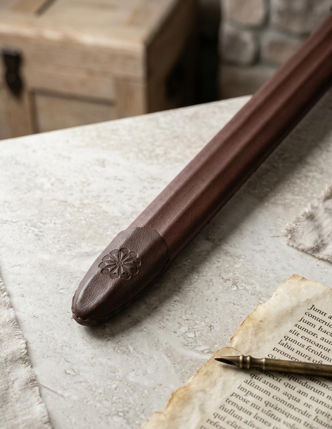 The grip, crafted with the historical technique of wet wrapping, offers a marked texture and a secure hold, designed for your hand to stay firm without forced gestures. The pommel with a floral motif adds a classic detail, while the straight guard ensures simple and functional protection with each handling.
