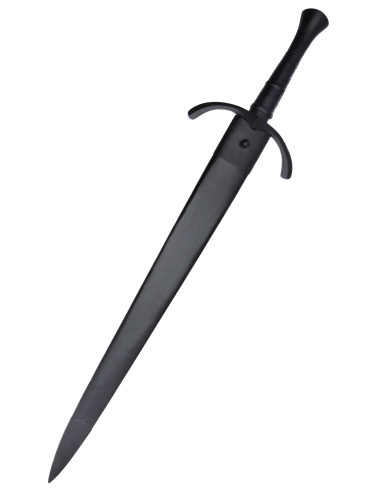 This collectible sword is a masterpiece of craftsmanship. The blade is made from hand forged carbon steel and has a 2.5mm cutting edge. The knob is rounded for greater security. The blade is bolted to the handle with a recessed sleeve nut. The handle parts are made of steel and wrapped in leather. The wooden scabbard is wrapped in leather.
