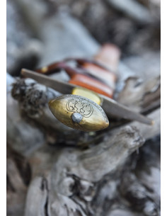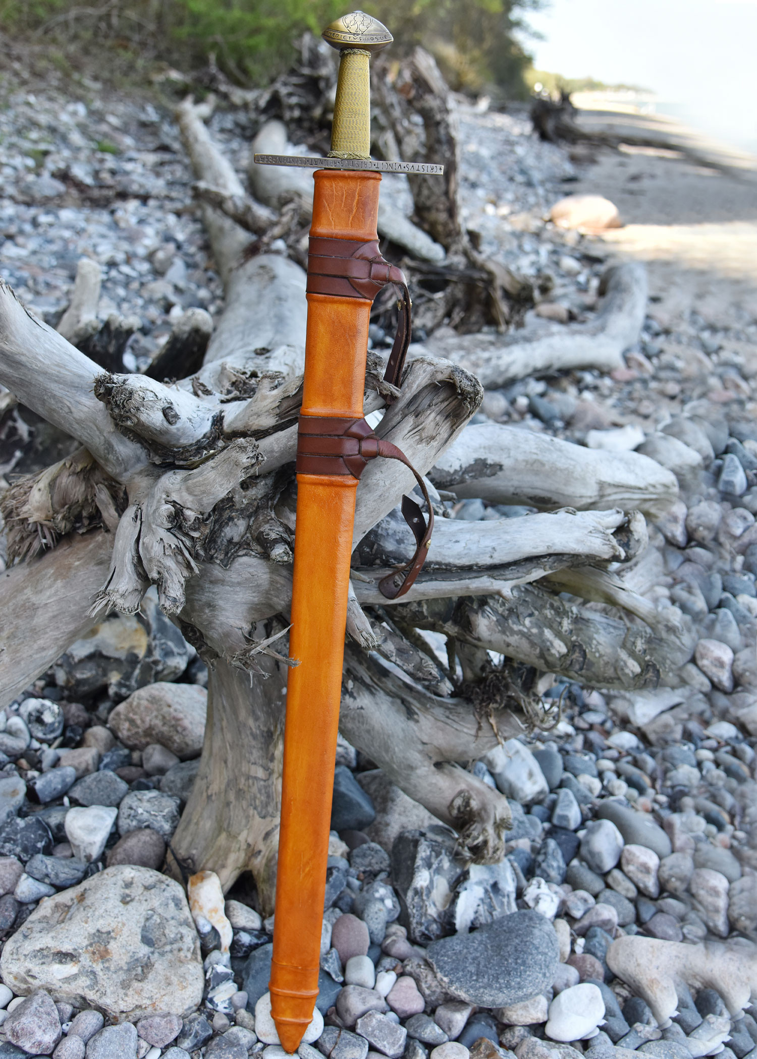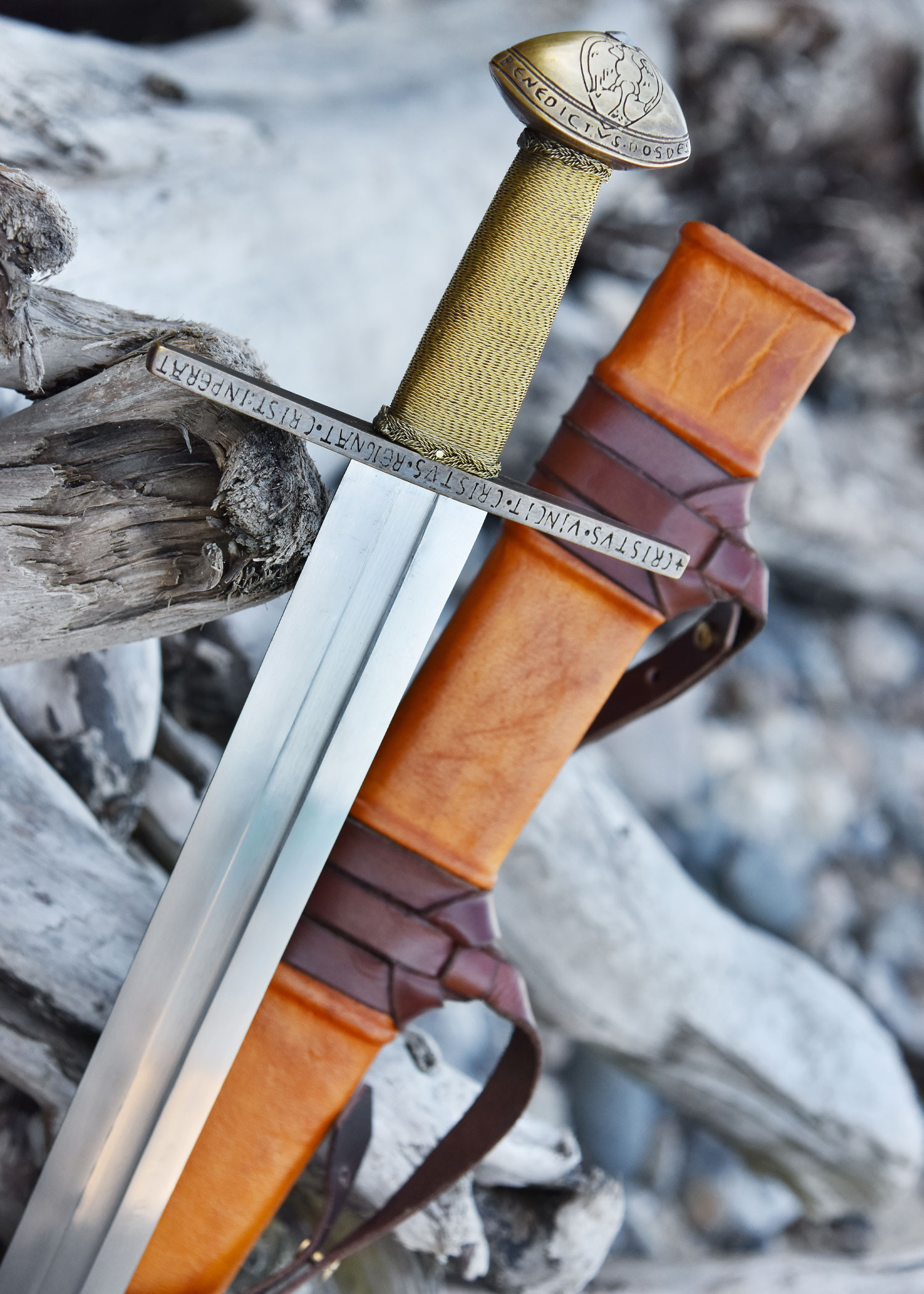 With a double-edged blade and fluting along two-thirds of its length, this sword features exceptional craftsmanship. The cross-shaped grip culminates in a Brazil nut-shaped pommel, engraved with the emblems of Emperor Otto IV and a powerful Latin inscription invoking divine blessing upon the wearer.