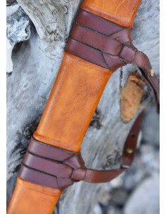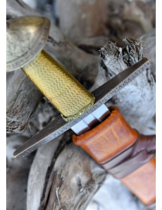 The wooden scabbard wrapped in genuine leather in an ocher tone completes the medieval aesthetic of this masterpiece. At approximately 104cm in overall length and a 35" blade, this sword is a gem for collectors and history enthusiasts alike.