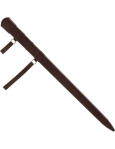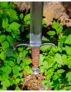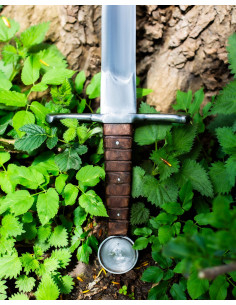 The image shows a piece in magnificent condition, with a smooth, shiny metal blade that contrasts with its sturdy brown handle, wrapped in synthetic leather for a firm and comfortable grip. Perfect for enthusiasts and professionals who want to showcase a quality replica or participate in performances, this sword is your ally to recreate legends of the past with style and safety.