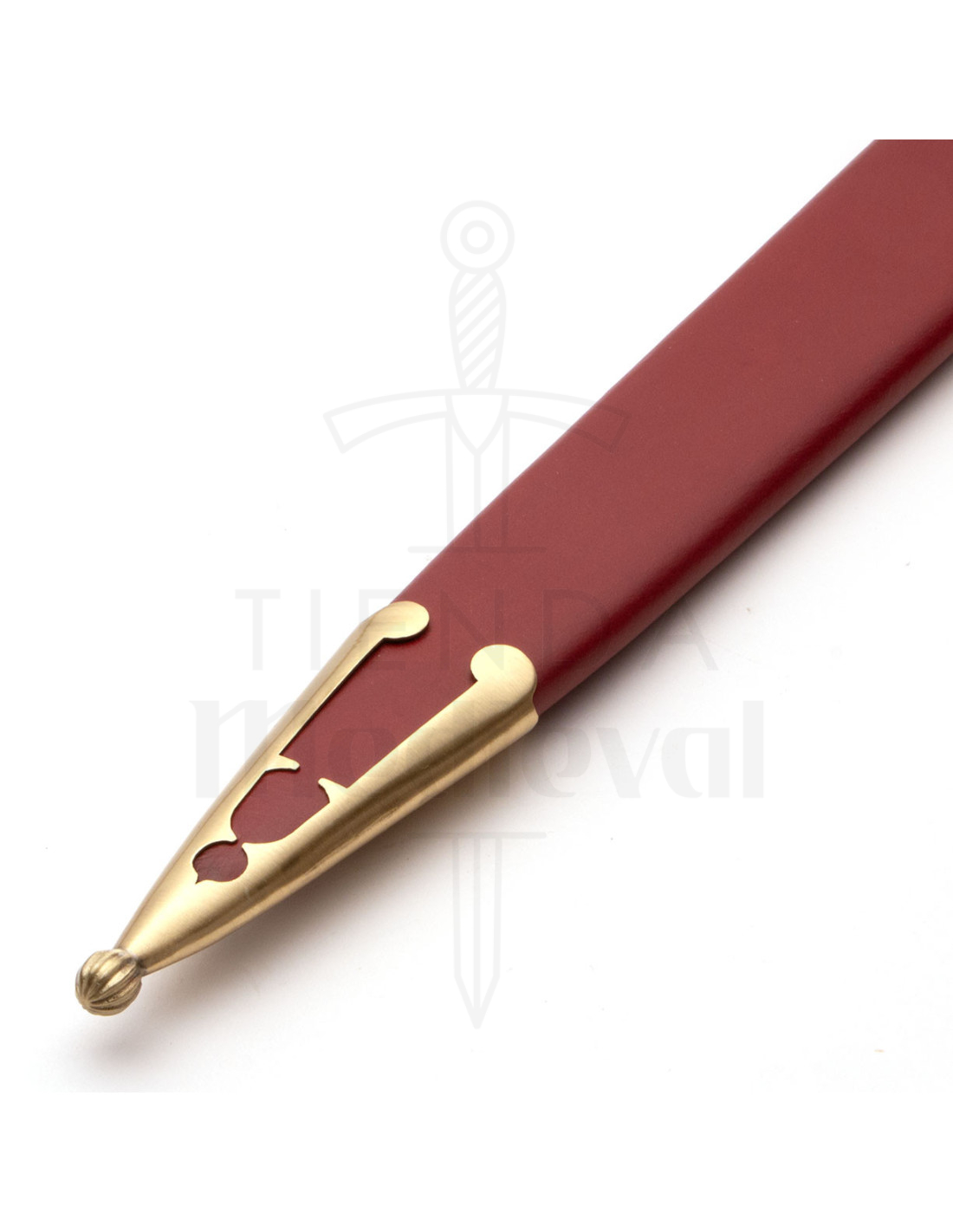 The faceted brass pommel, in addition to its notable presence, integrates a peened block that extends the tang, facilitating disassembly and future interventions, contributing longevity and adaptability to the piece. The combination of grip and sheath in red with brass details suggests rank and distinction, offering a coherent and elegant finish that protects the sword and stands out in any display.